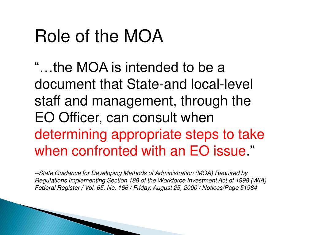 Role of the MOA “…the MOA is intended to be a document that State-and local-level staff and management, through the EO Officer, can consult when determining appropriate steps to take when confronted with an EO issue.” --State Guidance for Developing Methods of Administration (MOA) Required by Regulations Implementing Section 188 of the Workforce Investment Act of 1998 (WIA) Federal Register / Vol. 65, No. 166 / Friday, August 25, 2000 / Notices/Page 51984