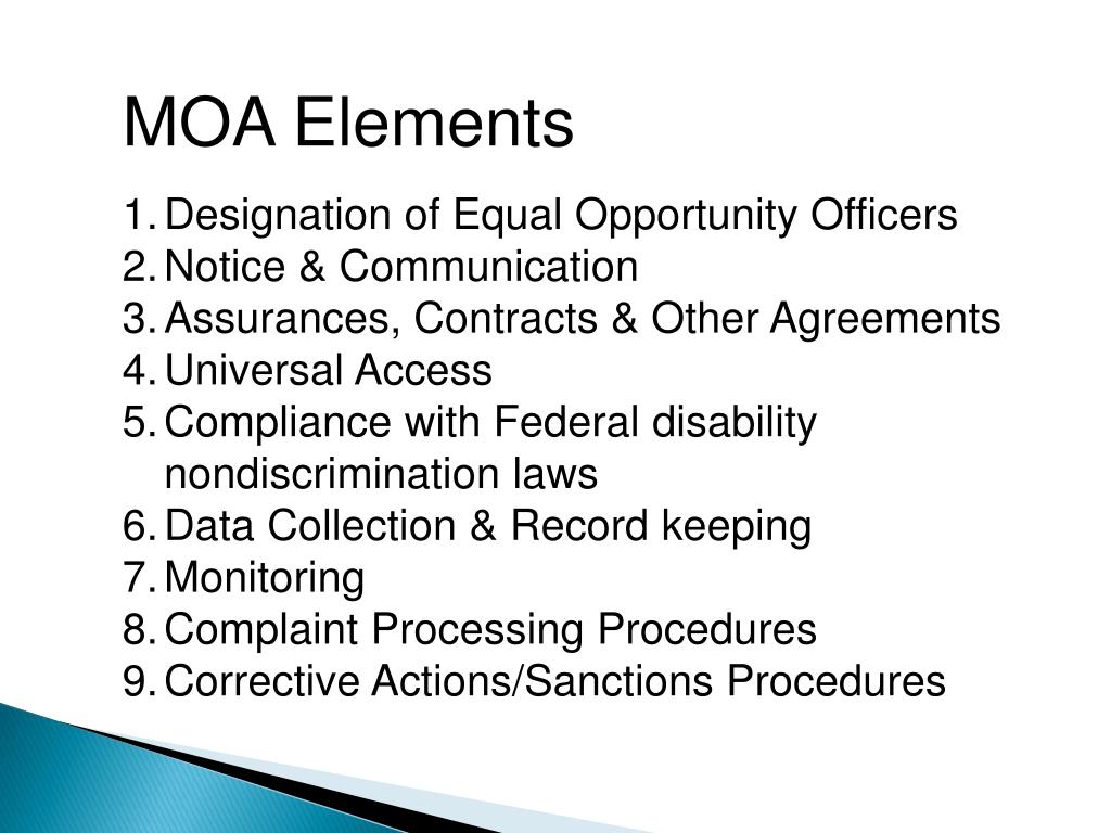 MOA Elements • Designation of Equal Opportunity Officers • Notice & Communication • Assurances, Contracts & Other Agreements • Universal Access • Compliance with Federal disability nondiscrimination laws • Data Collection & Record keeping • Monitoring • Complaint Processing Procedures • Corrective Actions/Sanctions Procedures