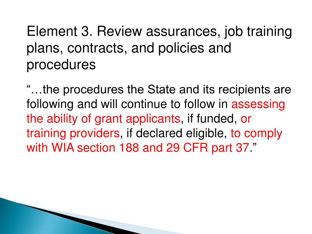 Element 3. Review assurances, job training plans, contracts, and policies and procedures “…the procedures the State and its recipients are following and will continue to follow in assessing the ability of grant applicants, if funded, or training providers, if declared eligible, to comply with WIA section 188 and 29 CFR part 37.”