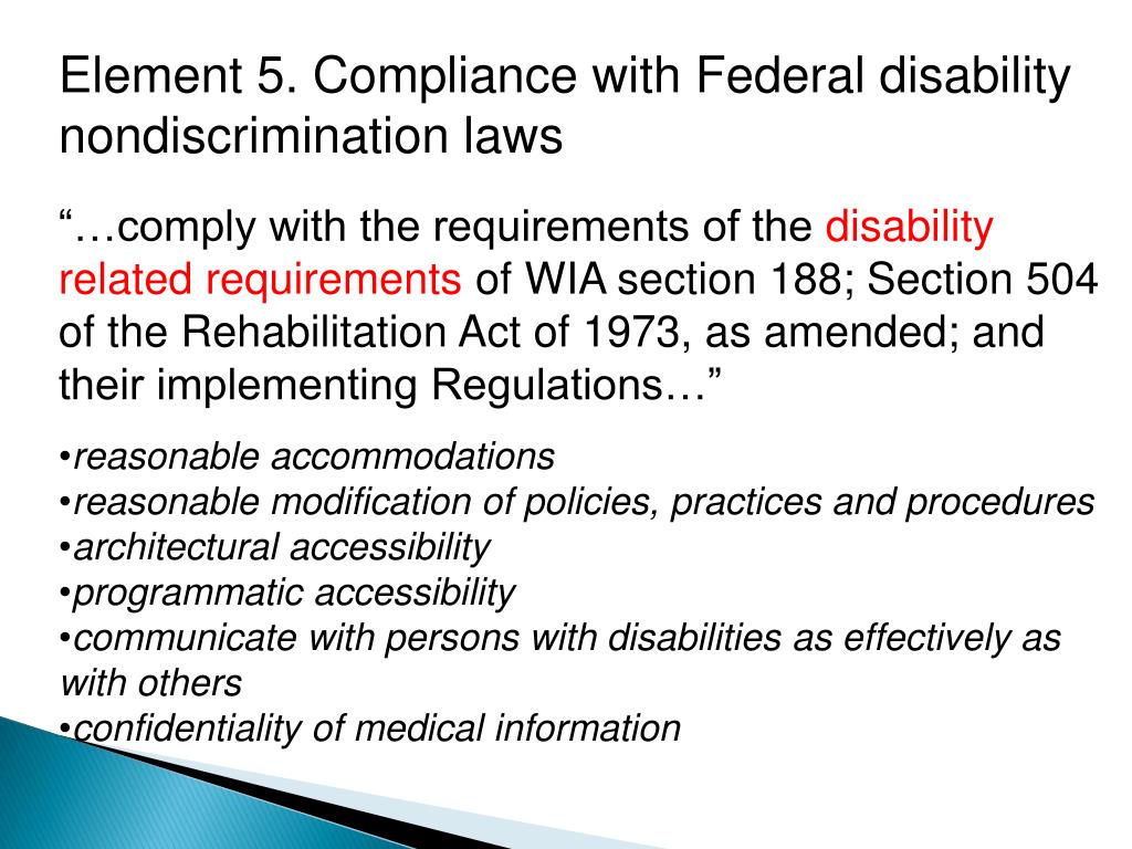 Element 5. Compliance with Federal disability nondiscrimination laws • “…comply with the requirements of the disability related requirements of WIA section 188; Section 504 of the Rehabilitation Act of 1973, as amended; and their implementing Regulations…” • reasonable accommodations • reasonable modification of policies, practices and procedures • architectural accessibility • programmatic accessibility • communicate with persons with disabilities as effectively as with others • confidentiality of medical information