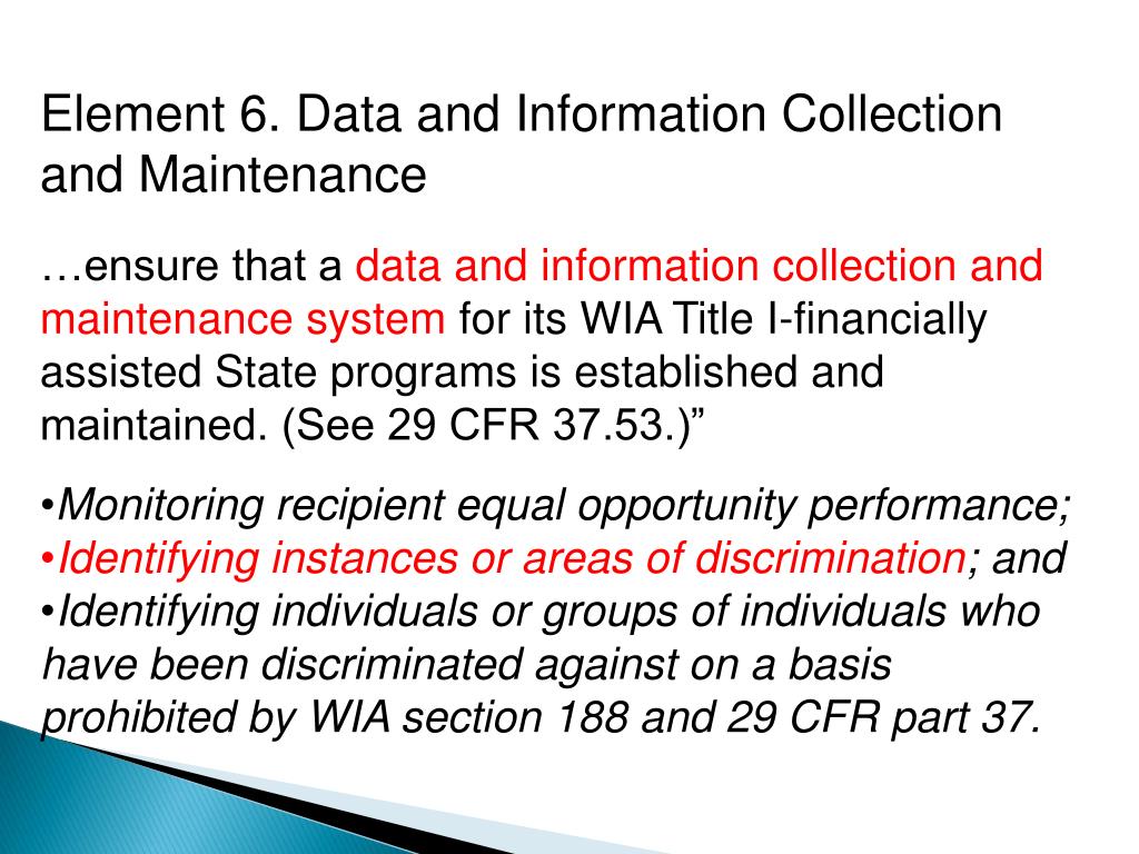 Element 6. Data and Information Collection and Maintenance • …ensure that a data and information collection and maintenance system for its WIA Title I-financially assisted State programs is established and maintained. (See 29 CFR 37.53.)” • Monitoring recipient equal opportunity performance; • Identifying instances or areas of discrimination; and • Identifying individuals or groups of individuals who have been discriminated against on a basis prohibited by WIA section 188 and 29 CFR part 37.