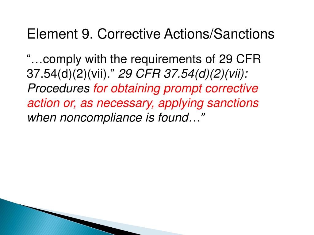 Element 9. Corrective Actions/Sanctions “…comply with the requirements of 29 CFR 37.54(d)(2)(vii).” 29 CFR 37.54(d)(2)(vii): Procedures for obtaining prompt corrective action or, as necessary, applying sanctions when noncompliance is found…”