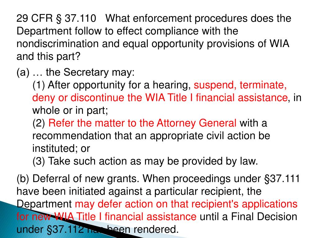 29 CFR § 37.110 What enforcement procedures does the Department follow to effect compliance with the nondiscrimination and equal opportunity provisions of WIA and this part? • (a) … the Secretary may: • (1) After opportunity for a hearing, suspend, terminate, deny or discontinue the WIA Title I financial assistance, in whole or in part; • (2) Refer the matter to the Attorney General with a recommendation that an appropriate civil action be instituted; or • (3) Take such action as may be provided by law. • (b) Deferral of new grants. When proceedings under §37.111 have been initiated against a particular recipient, the Department may defer action on that recipient's applications for new WIA Title I financial assistance until a Final Decision under §37.112 has been rendered.
