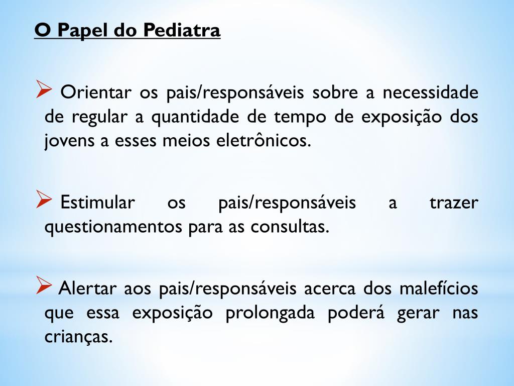O Papel do Pediatra Orientar os pais/responsáveis sobre a necessidade de regular a quantidade de tempo de exposição dos jovens a esses meios eletrônicos. Estimular os pais/responsáveis a trazer questionamentos para as consultas. Alertar aos pais/responsáveis acerca dos malefícios que essa exposição prolongada poderá gerar nas crianças.