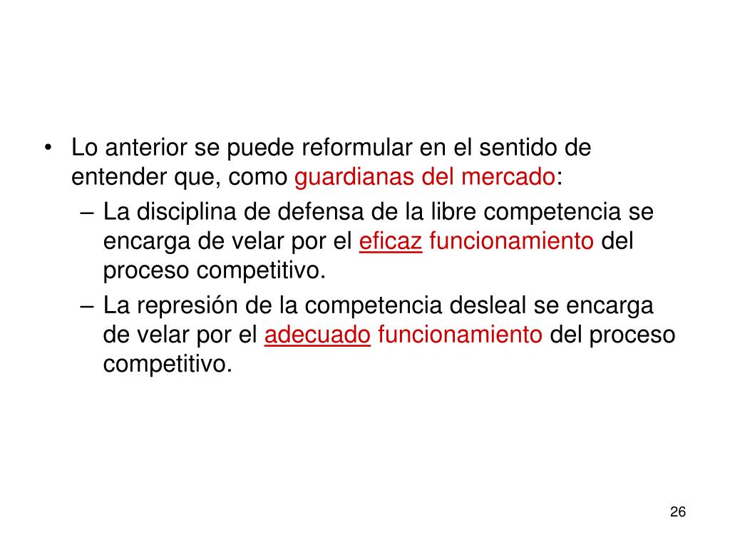 Lo anterior se puede reformular en el sentido de entender que, como guardianas del mercado: • La disciplina de defensa de la libre competencia se encarga de velar por el eficaz funcionamiento del proceso competitivo. • La represión de la competencia desleal se encarga de velar por el adecuado funcionamiento del proceso competitivo.