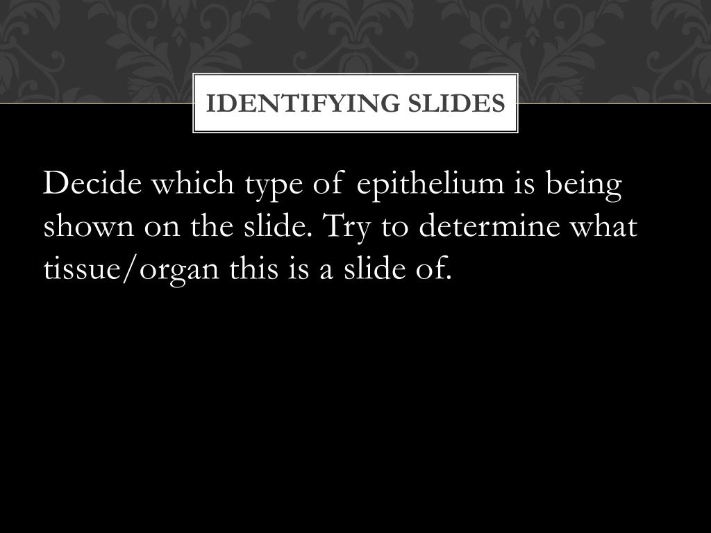 Identifying Slides • Decide which type of epithelium is being shown on the slide. Try to determine what tissue/organ this is a slide of.