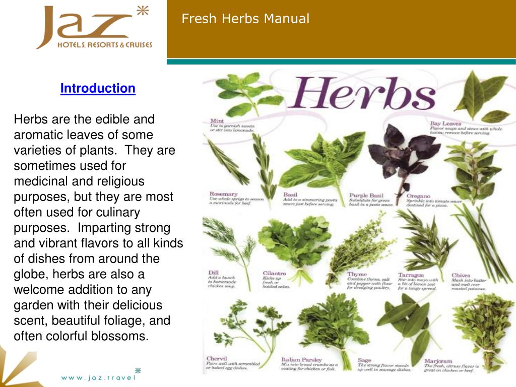 JAZ Food & Beverage. Fresh Herbs . Fresh Herbs Manual. Introduction Herbs are the edible and
