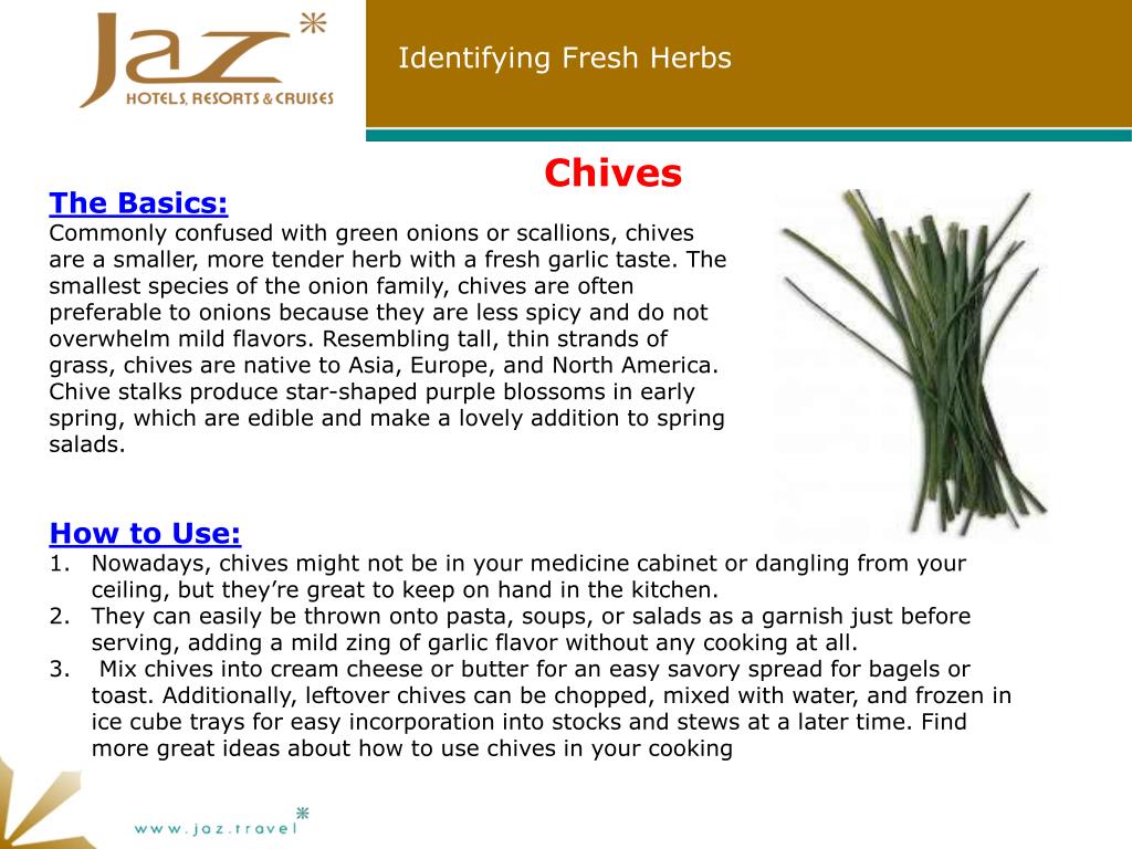 Identifying Fresh Herbs Chives The Basics: Commonly confused with green onions or scallions, chives are a smaller, more tender herb with a fresh garlic taste. The smallest species of the onion family, chives are often preferable to onions because they are less spicy and do not overwhelm mild flavors. Resembling tall, thin strands of grass, chives are native to Asia, Europe, and North America. Chive stalks produce star-shaped purple blossoms in early spring, which are edible and make a lovely addition to spring salads. How to Use: Nowadays, chives might not be in your medicine cabinet or dangling from your ceiling, but they’re great to keep on hand in the kitchen. They can easily be thrown onto pasta, soups, or salads as a garnish just before serving, adding a mild zing of garlic flavor without any cooking at all. Mix chives into cream cheese or butter for an easy savory spread for bagels or toast. Additionally, leftover chives can be chopped, mixed with water, and frozen in ice cube trays for easy incorporation into stocks and stews at a later time. Find more great ideas about how to use chives in your cooking