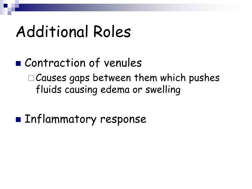 Additional Roles • Contraction of venules • Causes gaps between them which pushes fluids causing edema or swelling • Inflammatory response