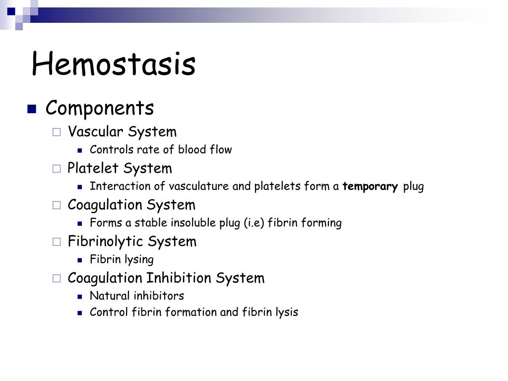 Hemostasis • Components • Vascular System • Controls rate of blood flow • Platelet System • Interaction of vasculature and platelets form a temporary plug • Coagulation System • Forms a stable insoluble plug (i.e) fibrin forming • Fibrinolytic System • Fibrin lysing • Coagulation Inhibition System • Natural inhibitors • Control fibrin formation and fibrin lysis