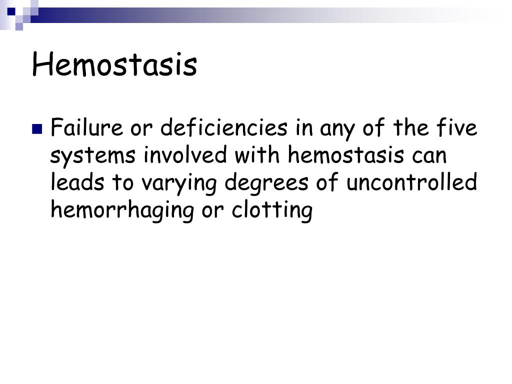Hemostasis Failure or deficiencies in any of the five systems involved with hemostasis can leads to varying degrees of uncontrolled hemorrhaging or clotting
