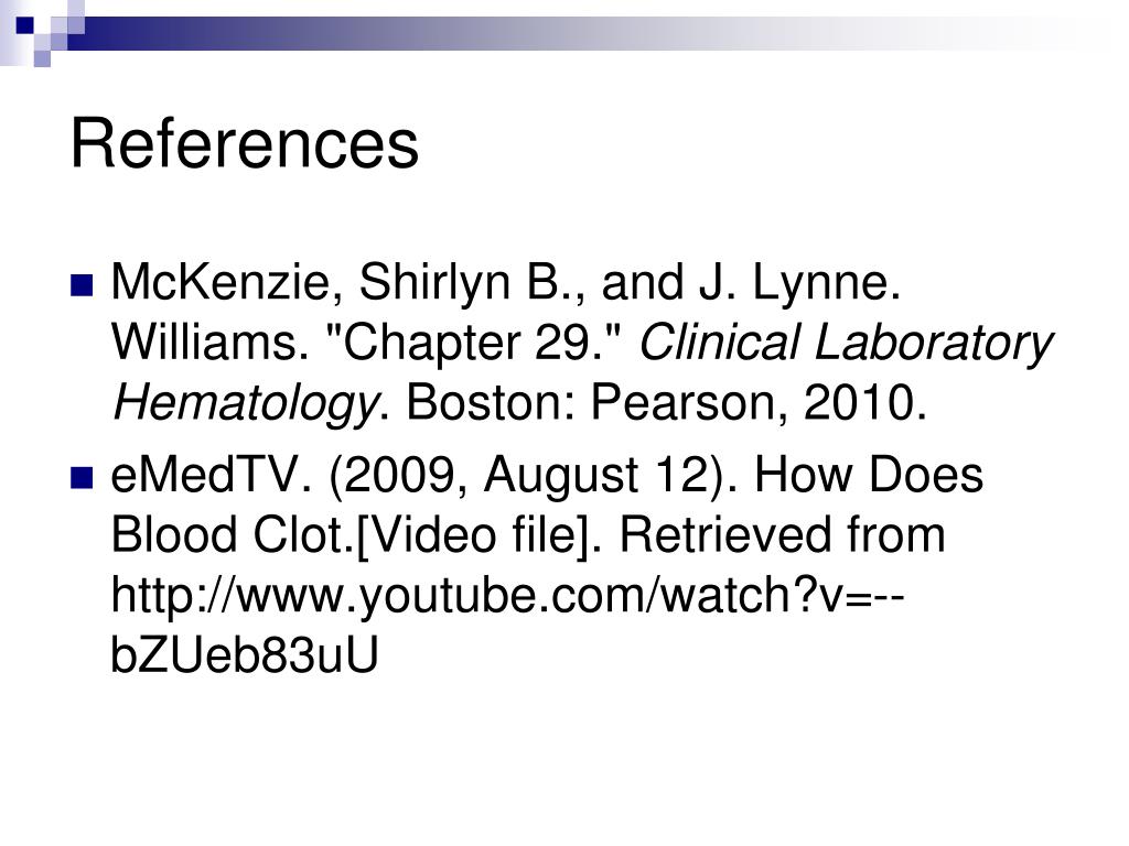 References McKenzie, Shirlyn B., and J. Lynne. Williams. "Chapter 29." Clinical Laboratory Hematology. Boston: Pearson, 2010. eMedTV. (2009, August 12). How Does Blood Clot.[Video file]. Retrieved from http://www.youtube.com/watch?v=--bZUeb83uU
