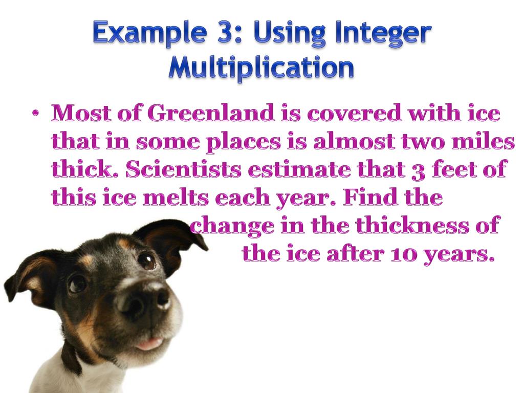 Example 3: Using Integer Multiplication Most of Greenland is covered with ice that in some places is almost two miles thick. Scientists estimate that 3 feet of this ice melts each year. Find the change in the thickness of the ice after 10 years.