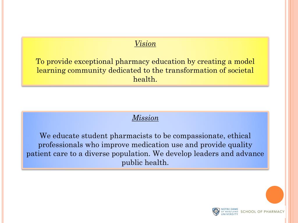 Vision To provide exceptional pharmacy education by creating a model learning community dedicated to the transformation of societal health. Mission We educate student pharmacists to be compassionate, ethical professionals who improve medication use and provide quality patient care to a diverse population. We develop leaders and advance public health.