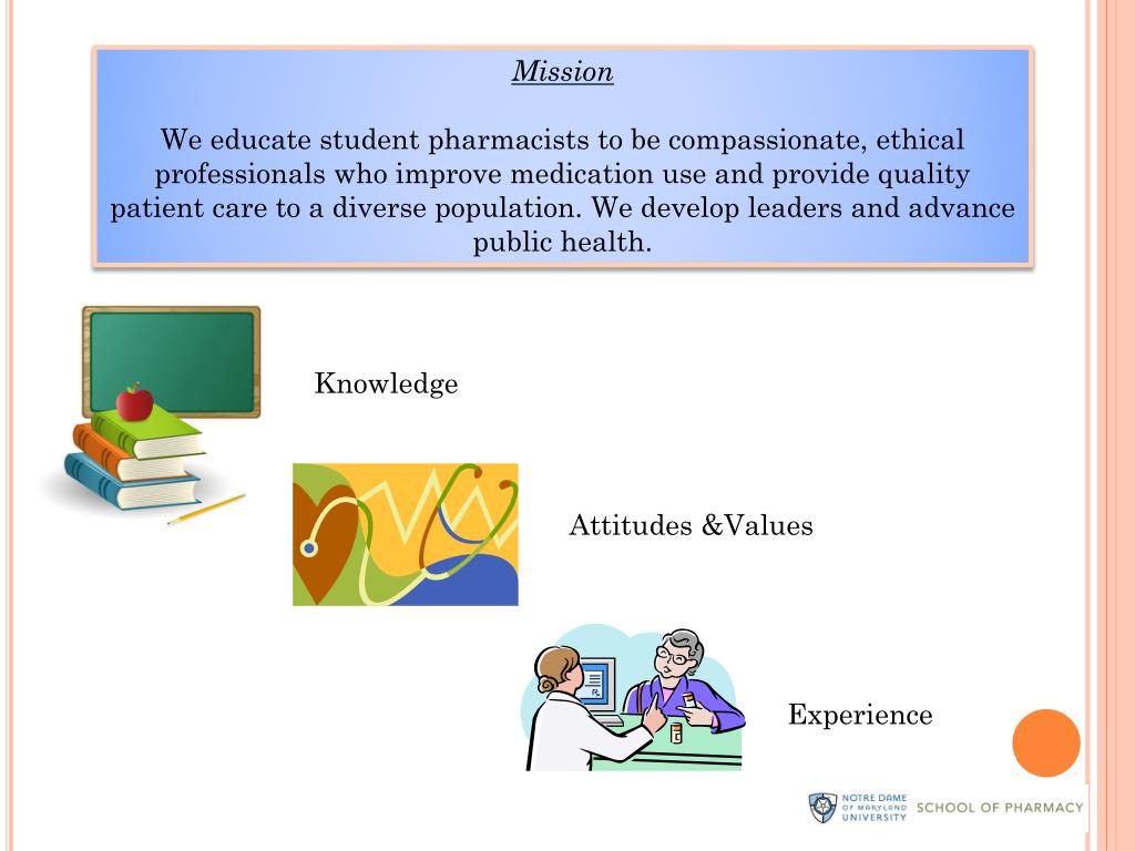 Mission We educate student pharmacists to be compassionate, ethical professionals who improve medication use and provide quality patient care to a diverse population. We develop leaders and advance public health. Knowledge Attitudes &Values Experience