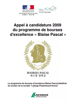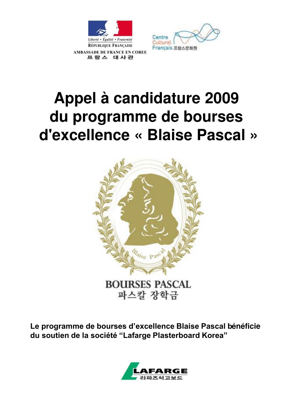 Appel à candidature 2009 du programme de bourses d'excellence « Blaise Pascal ». Le programme de bourses d’excellence Blaise Pascal b énéficie du soutien de la société “Lafarge Plasterboard Korea”. Appel à candidature 2009 du programme de bourses d'excellence « Blaise Pascal »