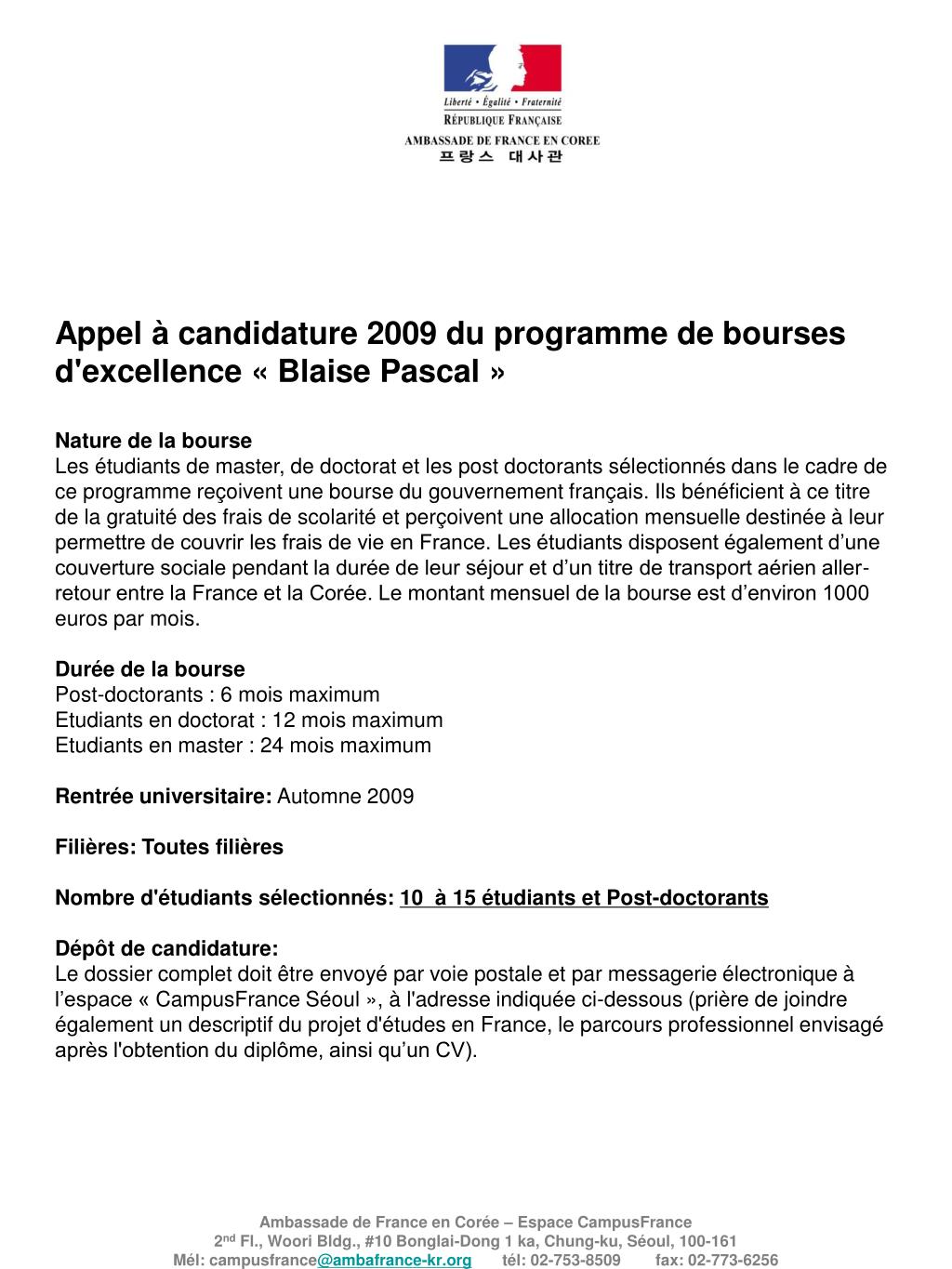 Appel à candidature 2009 du programme de bourses d'excellence « Blaise Pascal » Nature de la bourse Les étudiants de master, de doctorat et les post doctorants sélectionnés dans le cadre de ce programme reçoivent une bourse du gouvernement français. Ils bénéficient à ce titre de la gratuité des frais de scolarité et perçoivent une allocation mensuelle destinée à leur permettre de couvrir les frais de vie en France. Les étudiants disposent également d’une couverture sociale pendant la durée de leur séjour et d’un titre de transport aérien aller-retour entre la France et la Corée. Le montant mensuel de la bourse est d’environ 1000 euros par mois. Durée de la bourse Post-doctorants : 6 mois maximum Etudiants en doctorat : 12 mois maximum Etudiants en master : 24 mois maximum Rentrée universitaire: Automne 2009 Filières: Toutes filières Nombre d'étudiants sélectionnés:10 à 15 étudiants et Post-doctorants Dépôt de candidature: Le dossier complet doit être envoyé par voie postale et par messagerie électronique à l’espace « CampusFrance Séoul », à l'adresse indiquée ci-dessous (prière de joindre également un descriptif du projet d'études en France, le parcours professionnel envisagé après l'obtention du diplôme, ainsi qu’un CV). Ambassade de France en Corée – Espace CampusFrance 2nd Fl., Woori Bldg., #10 Bonglai-Dong 1 ka, Chung-ku, Séoul, 100-161 Mél: campusfrance@ambafrance-kr.org tél: 02-753-8509 fax: 02-773-6256