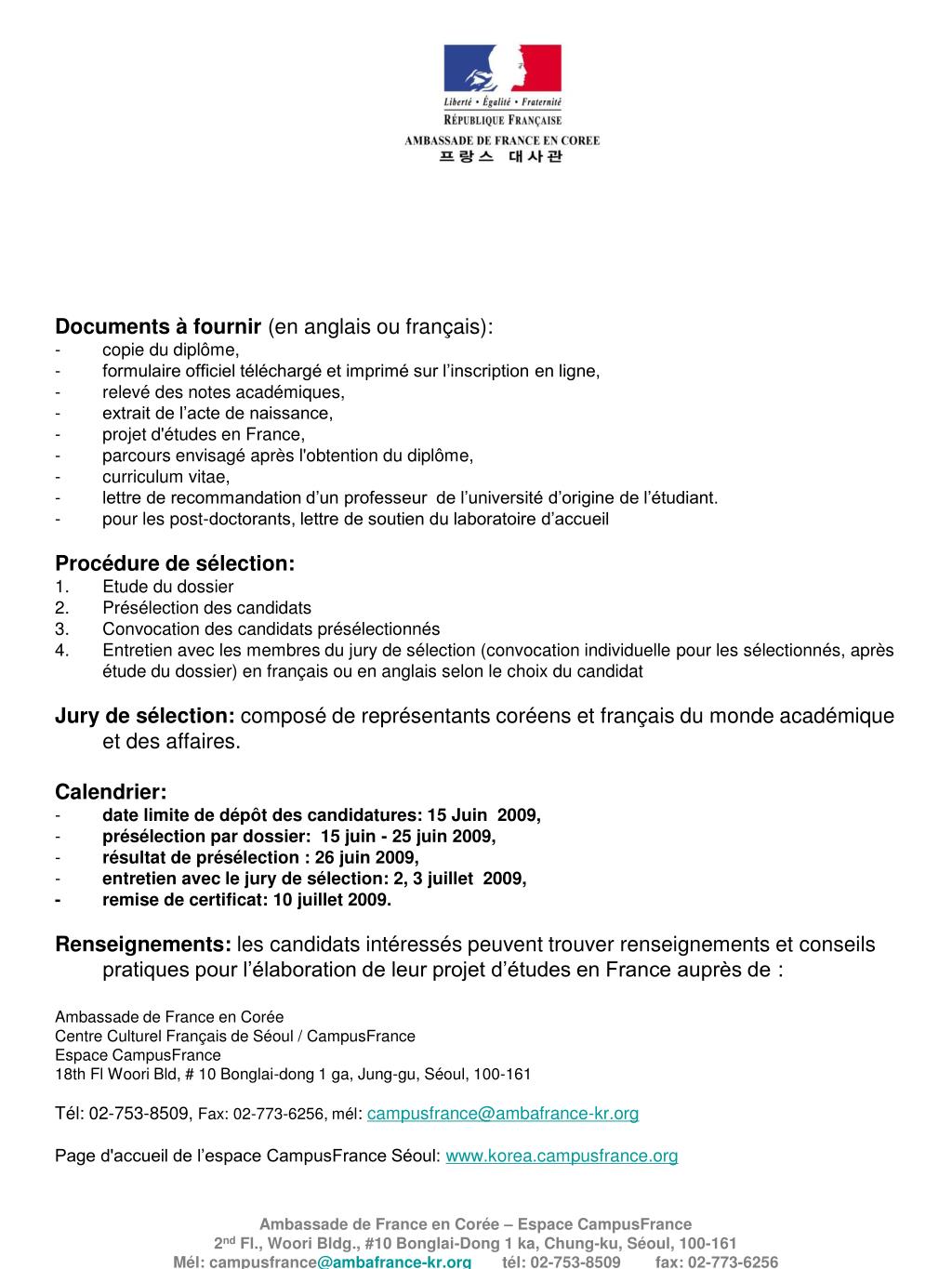 Documents à fournir (en anglais ou français): • copie du diplôme, • formulaire officiel téléchargé et imprimé sur l’inscription en ligne, • - relevé des notes académiques, • - extrait de l’acte de naissance, • - projet d'études en France, • - parcours envisagé après l'obtention du diplôme, • curriculum vitae, • lettre de recommandation d’un professeur de l’université d’origine de l’étudiant. • pour les post-doctorants, lettre de soutien du laboratoire d’accueil • Procédure de sélection: • Etude du dossier • Présélection des candidats • Convocation des candidats présélectionnés • Entretien avec les membres du jury de sélection (convocation individuelle pour les sélectionnés, après étude du dossier) en français ou en anglais selon le choix du candidat • Jury de sélection: composé de représentants coréens et français du monde académique et des affaires. • Calendrier: • date limite de dépôt des candidatures: 15 Juin 2009, • présélection par dossier: 15 juin - 25 juin 2009, • résultat de présélection : 26 juin 2009, • entretien avec le jury de sélection: 2, 3 juillet 2009, • - remise de certificat: 10 juillet 2009. • Renseignements: les candidats intéressés peuvent trouver renseignements et conseils pratiques pour l’élaboration de leur projet d’études en France auprès de : • Ambassade de France en Corée • Centre Culturel Français de Séoul / CampusFrance • Espace CampusFrance • 18th Fl Woori Bld, # 10 Bonglai-dong 1 ga, Jung-gu, Séoul, 100-161 • Tél: 02-753-8509, Fax: 02-773-6256, mél: campusfrance@ambafrance-kr.org • Page d'accueil de l’espace CampusFrance Séoul: www.korea.campusfrance.org Ambassade de France en Corée – Espace CampusFrance 2nd Fl., Woori Bldg., #10 Bonglai-Dong 1 ka, Chung-ku, Séoul, 100-161 Mél: campusfrance@ambafrance-kr.org tél: 02-753-8509 fax: 02-773-6256