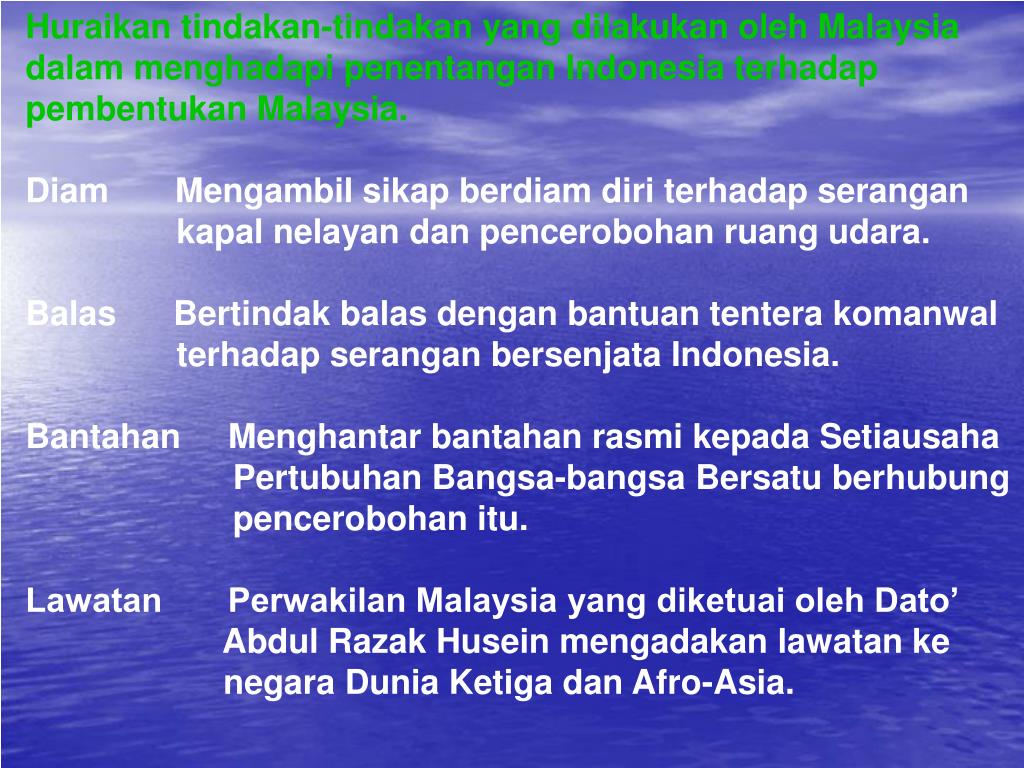 Huraikan tindakan-tindakan yang dilakukan oleh Malaysia dalam menghadapi penentangan Indonesia terhadap pembentukan Malaysia. Diam Mengambil sikap berdiam diri terhadap serangan kapal nelayan dan pencerobohan ruang udara. Balas Bertindak balas dengan bantuan tentera komanwal terhadap serangan bersenjata Indonesia. Bantahan Menghantar bantahan rasmi kepada Setiausaha Pertubuhan Bangsa-bangsa Bersatu berhubung pencerobohan itu. Lawatan Perwakilan Malaysia yang diketuai oleh Dato’ Abdul Razak Husein mengadakan lawatan ke negara Dunia Ketiga dan Afro-Asia.