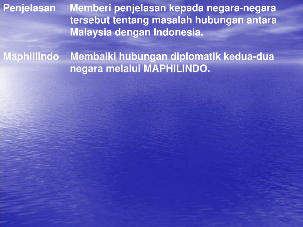 Penjelasan Memberi penjelasan kepada negara-negara tersebut tentang masalah hubungan antara Malaysia dengan Indonesia. Maphillindo Membaiki hubungan diplomatik kedua-dua negara melalui MAPHILINDO.