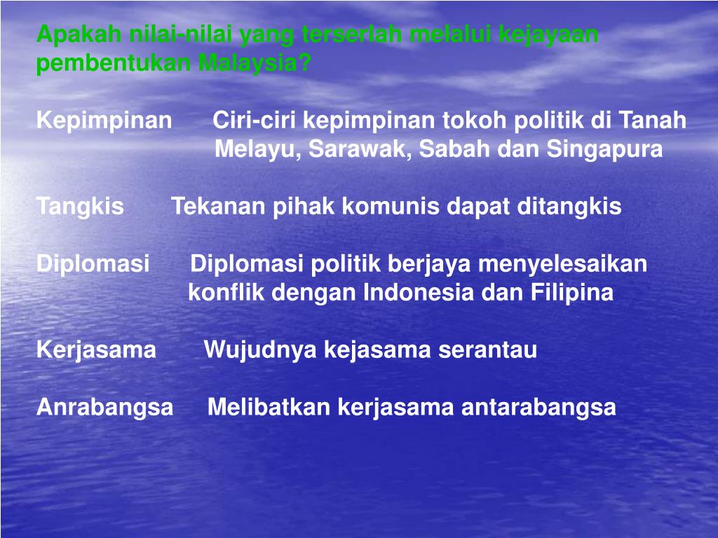 Apakah nilai-nilai yang terserlah melalui kejayaan pembentukan Malaysia? Kepimpinan Ciri-ciri kepimpinan tokoh politik di Tanah Melayu, Sarawak, Sabah dan Singapura Tangkis Tekanan pihak komunis dapat ditangkis Diplomasi Diplomasi politik berjaya menyelesaikan konflik dengan Indonesia dan Filipina Kerjasama Wujudnya kejasama serantau Anrabangsa Melibatkan kerjasama antarabangsa