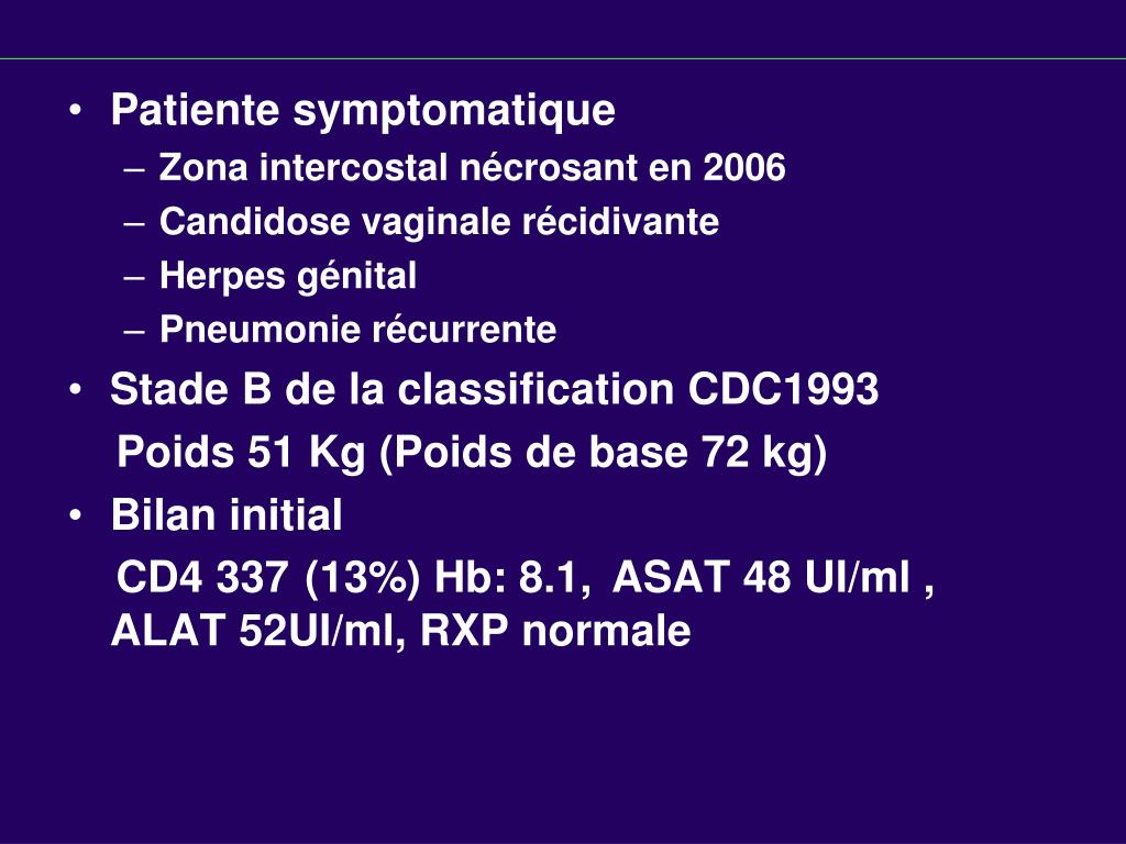 Patiente symptomatique • Zona intercostal nécrosant en 2006 • Candidose vaginale récidivante • Herpes génital • Pneumonie récurrente • Stade B de la classification CDC1993 Poids 51 Kg (Poids de base 72 kg) • Bilan initial CD4 337 (13%) Hb: 8.1,ASAT 48 UI/ml , ALAT 52UI/ml, RXP normale