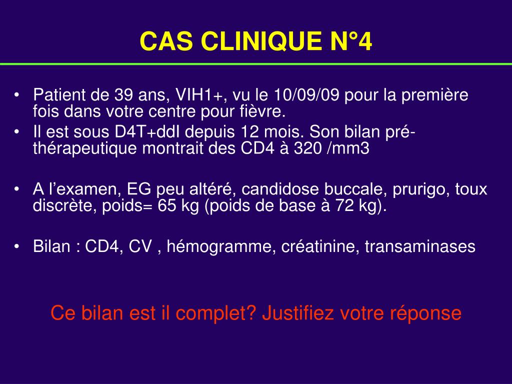 CAS CLINIQUE N°4 • Patient de 39 ans, VIH1+, vu le 10/09/09 pour la première fois dans votre centre pour fièvre. • Il est sous D4T+ddI depuis 12 mois. Son bilan pré-thérapeutique montrait des CD4 à 320 /mm3 • A l’examen, EG peu altéré, candidose buccale, prurigo, toux discrète, poids= 65 kg (poids de base à 72 kg). • Bilan : CD4, CV , hémogramme, créatinine, transaminases Ce bilan est il complet? Justifiez votre réponse
