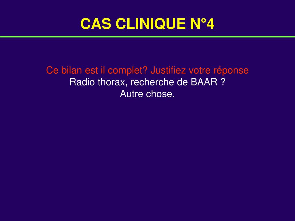 CAS CLINIQUE N°4 Ce bilan est il complet? Justifiez votre réponse Radio thorax, recherche de BAAR ? Autre chose.