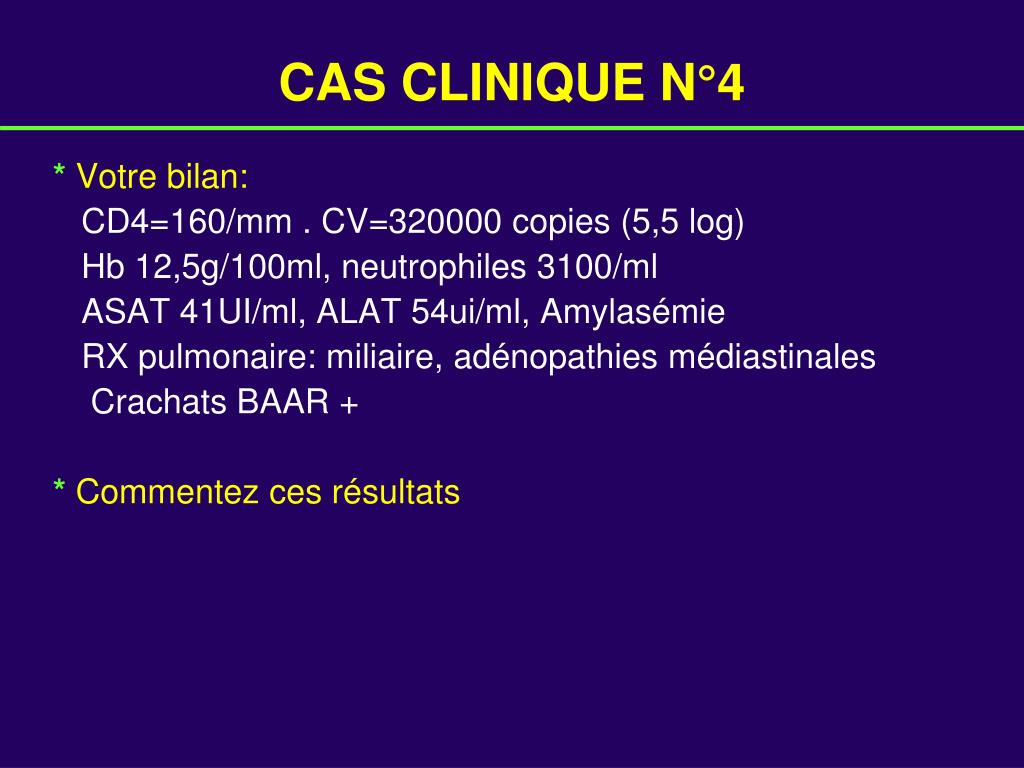 CAS CLINIQUE N°4 * Votre bilan: CD4=160/mm . CV=320000 copies (5,5 log) Hb 12,5g/100ml, neutrophiles 3100/ml ASAT 41UI/ml, ALAT 54ui/ml, Amylasémie RX pulmonaire: miliaire, adénopathies médiastinales Crachats BAAR + *Commentez ces résultats