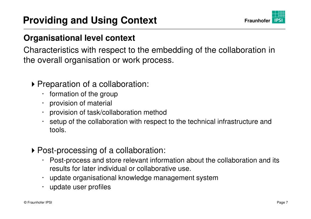 Providing and Using Context • Organisational level context • Characteristics with respect to the embedding of the collaboration in the overall organisation or work process. • Preparation of a collaboration: • formation of the group • provision of material • provision of task/collaboration method • setup of the collaboration with respect to the technical infrastructure and tools. • Post-processing of a collaboration: • Post-process and store relevant information about the collaboration and its results for later individual or collaborative use. • update organisational knowledge management system • update user profiles
