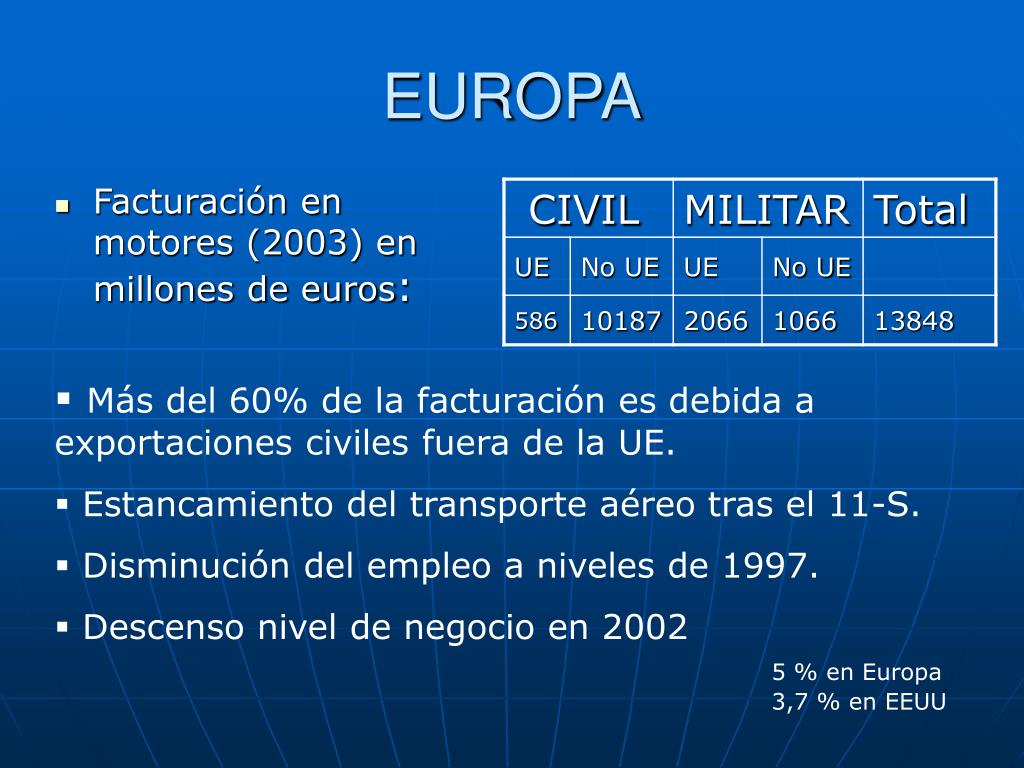 EUROPA • Facturación en motores (2003) en millones de euros: • Más del 60% de la facturación es debida a exportaciones civiles fuera de la UE. • Estancamiento del transporte aéreo tras el 11-S. • Disminución del empleo a niveles de 1997. • Descenso nivel de negocio en 2002 5 % en Europa 3,7 % en EEUU