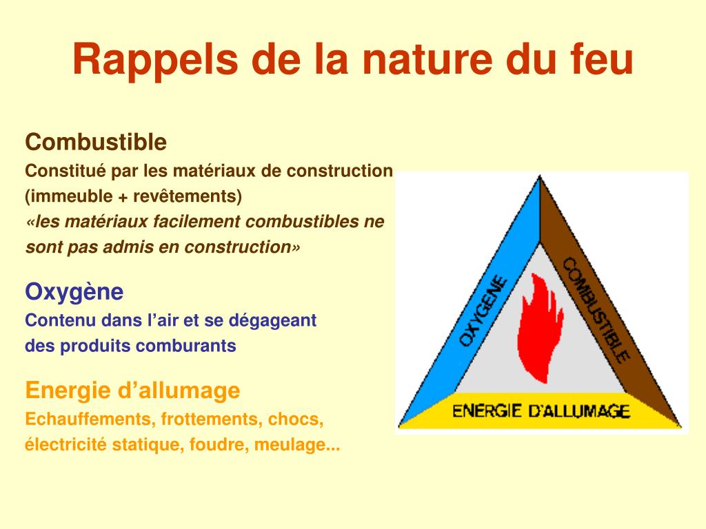 Rappels de la nature du feu. Combustible Constitué par les matériaux de construction (immeuble + revêtements) «les matériaux facilement combustibles ne sont pas admis en construction» Oxygène Contenu dans l’air et se dégageant des produits comburants Energie d’allumage