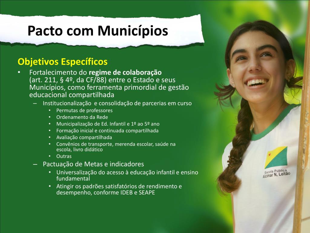 Pacto com Municípios • Objetivos Específicos • Fortalecimento do regime de colaboração (art. 211, § 4º, da CF/88) entre o Estado e seus Municípios, como ferramenta primordial de gestão educacional compartilhada • Institucionalização e consolidação de parcerias em curso • Permutas de professores • Ordenamento da Rede • Municipalização de Ed. Infantil e 1º ao 5º ano • Formação inicial e continuada compartilhada • Avaliação compartilhada • Convênios de transporte, merenda escolar, saúde na escola, livro didático • Outras • Pactuação de Metas e indicadores • Universalização do acesso à educação infantil e ensino fundamental • Atingir os padrões satisfatórios de rendimento e desempenho, conforme IDEB e SEAPE