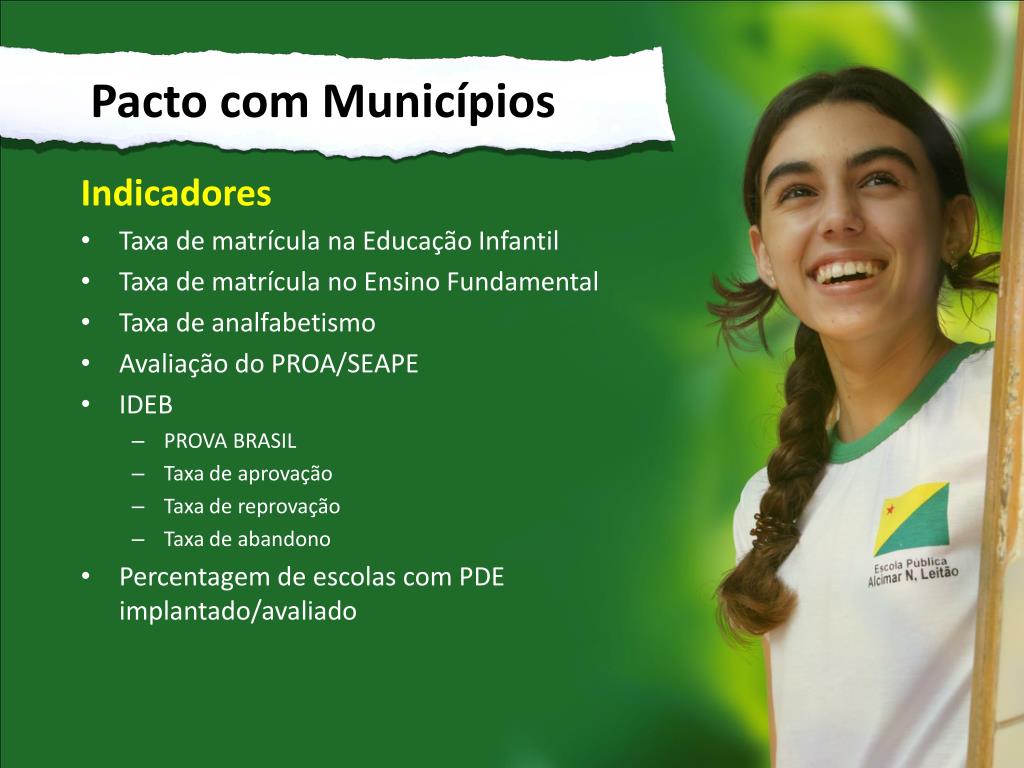 Pacto com Municípios • Indicadores • Taxa de matrícula na Educação Infantil • Taxa de matrícula no Ensino Fundamental • Taxa de analfabetismo • Avaliação do PROA/SEAPE • IDEB • PROVA BRASIL • Taxa de aprovação • Taxa de reprovação • Taxa de abandono • Percentagem de escolas com PDE implantado/avaliado