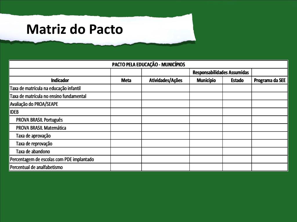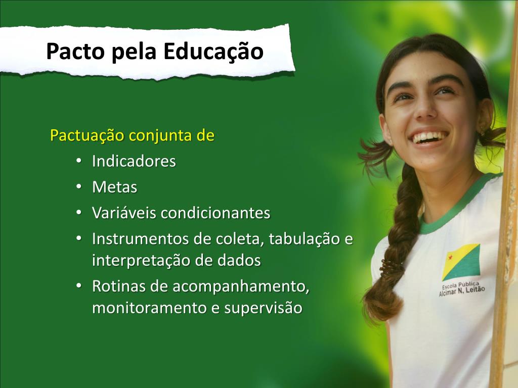 Pacto pela Educação • Pactuação conjunta de • Indicadores • Metas • Variáveis condicionantes • Instrumentos de coleta, tabulação e interpretação de dados • Rotinas de acompanhamento, monitoramento e supervisão