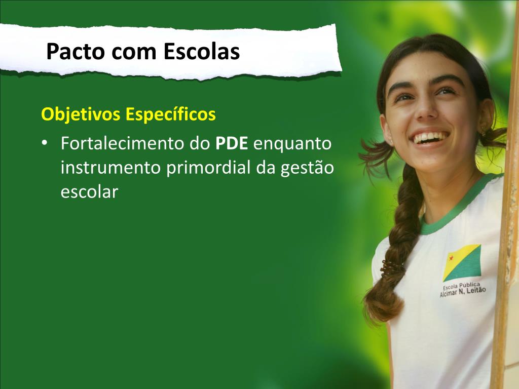 Pacto com Escolas • Objetivos Específicos • Fortalecimento do PDE enquanto instrumento primordial da gestão escolar
