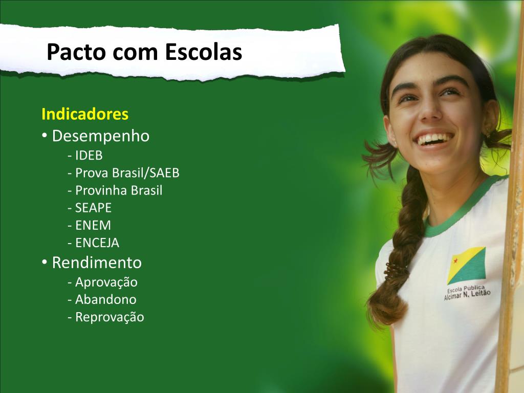 Pacto com Escolas • Indicadores • Desempenho • IDEB • Prova Brasil/SAEB • Provinha Brasil • SEAPE • ENEM • ENCEJA • Rendimento • Aprovação • Abandono • Reprovação