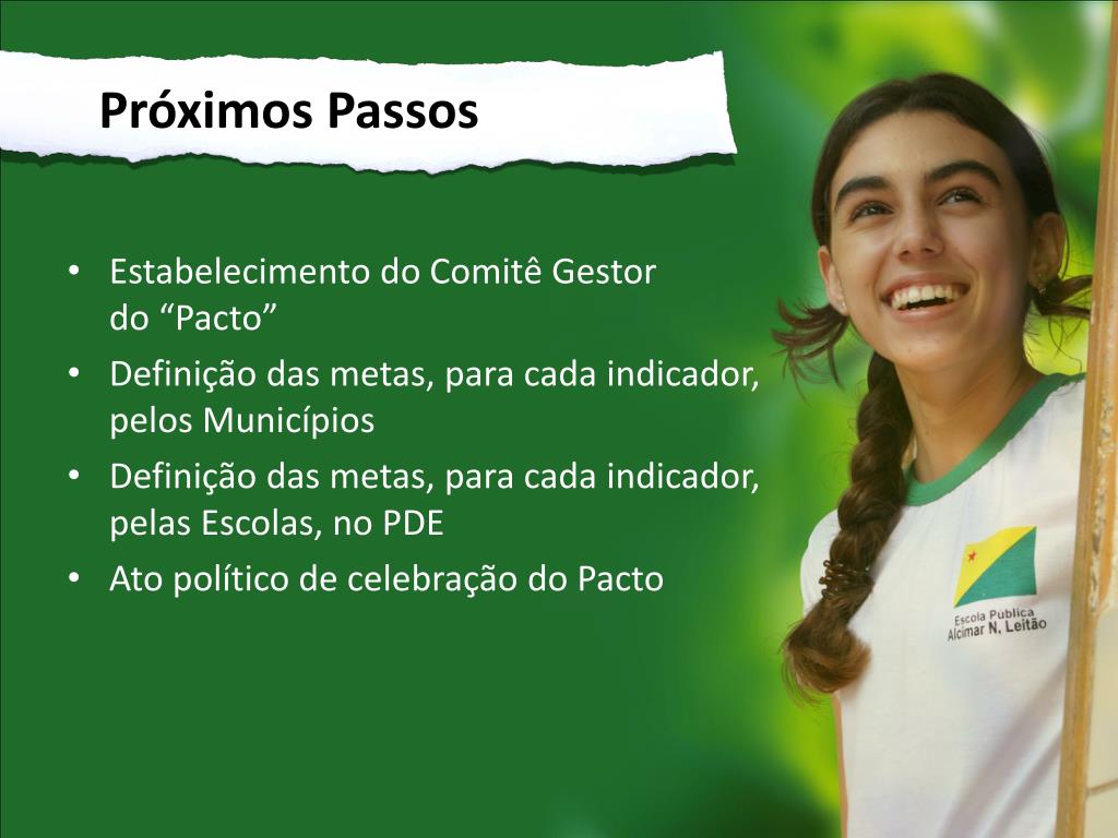 Próximos Passos • Estabelecimento do Comitê Gestor do “Pacto” • Definição das metas, para cada indicador, pelos Municípios • Definição das metas, para cada indicador, pelas Escolas, no PDE • Ato político de celebração do Pacto