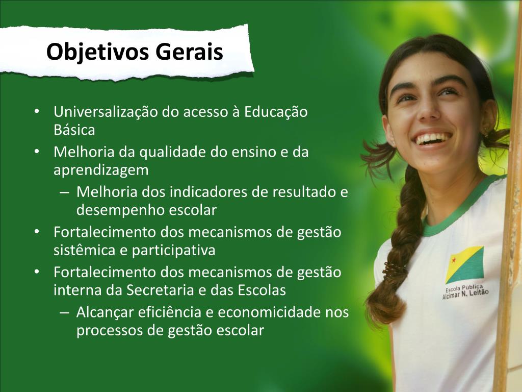 Objetivos Gerais • Universalização do acesso à Educação Básica • Melhoria da qualidade do ensino e da aprendizagem • Melhoria dos indicadores de resultado e desempenho escolar • Fortalecimento dos mecanismos de gestão sistêmica e participativa • Fortalecimento dos mecanismos de gestão interna da Secretaria e das Escolas • Alcançar eficiência e economicidade nos processos de gestão escolar