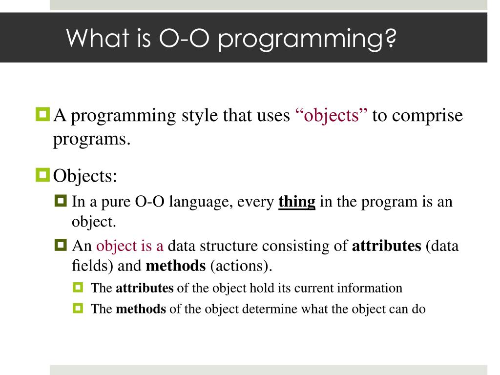 What is O-O programming? • Aprogrammingstyle thatuses“objects” to comprise programs. • Objects: • In a pure O-O language, every thing in the program is an object. • An object is adatastructureconsistingofattributes(datafields)andmethods(actions). • Theattributes oftheobject hold its current information • Themethods of the object determine what the object can do