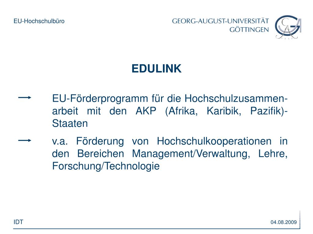 EDULINK EU-Förderprogramm für die Hochschulzusammen-arbeit mit den AKP (Afrika, Karibik, Pazifik)-Staaten v.a. Förderung von Hochschulkooperationen in den Bereichen Management/Verwaltung, Lehre, Forschung/Technologie IDT