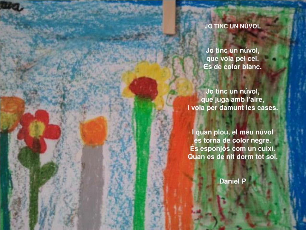 JO TINC UN NÚVOLJo tinc un núvol,que vola pel cel. És de color blanc.Jo tinc un núvol,que juga amb l'aire,i vola per damunt les cases.I quan plou, el meu núvoles torna de color negre.És esponjós com un cuixí.Quan és de nit dorm tot sol.Daniel P