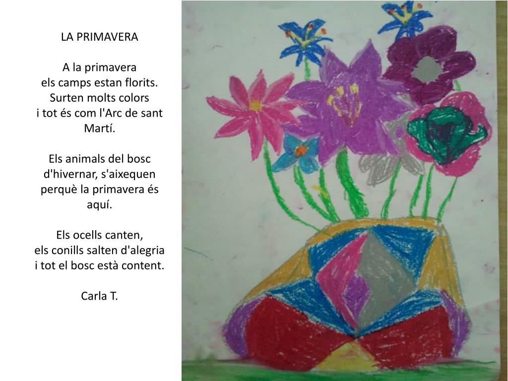 LA PRIMAVERAA la primaveraels camps estan florits.Surten molts colorsi tot és com l'Arc de sant Martí.Els animals del boscd'hivernar, s'aixequenperquè la primavera és aquí.Els ocells canten,els conills salten d'alegriai tot el bosc està content.Carla T.
