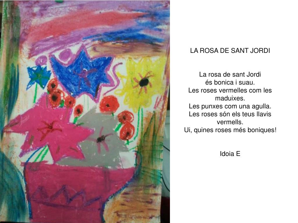 LA ROSA DE SANT JORDILa rosa de sant Jordiés bonica i suau.Les roses vermelles com les maduixes.Les punxes com una agulla.Les roses són els teus llavis vermells.Ui, quines roses més boniques!Idoia E