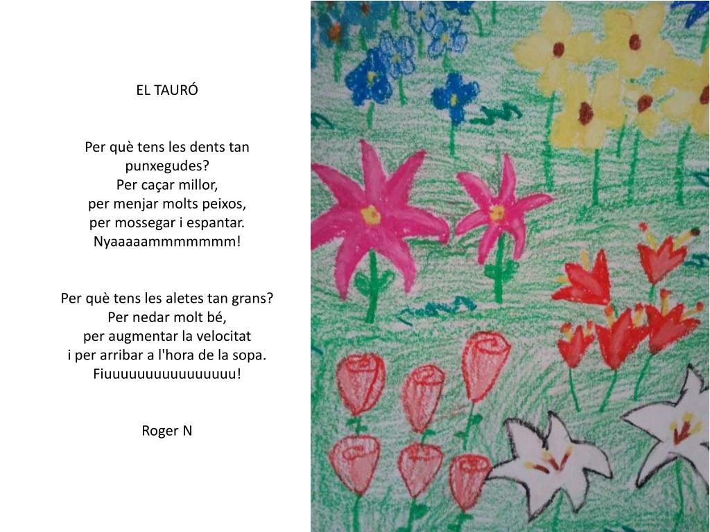 EL TAURÓPer què tens les dents tan punxegudes?Per caçar millor,per menjar molts peixos,per mossegar i espantar.Nyaaaaammmmmmm!Per què tens les aletes tan grans?Per nedar molt bé,per augmentar la velocitati per arribar a l'hora de la sopa.Fiuuuuuuuuuuuuuuuu!Roger N
