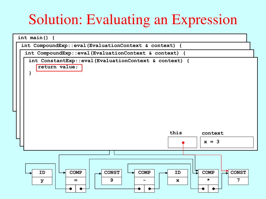 CONST COMP COMP COMP ID ID 9 * = - y x Solution: Evaluating an Expression int main() { EvaluationContext context; context.setValue("x", 2); TokenScanner scanner = new TokenScanner("y = (9 – x) * 7"); scanner.ignoreWhitespace(); scanner.scanNumbers(); Expression *exp =parseExp(scanner); cout << exp.eval(context) << endl; return 0; } int CompoundExp::eval(EvaluationContext & context) { int right = rhs->eval(context); if (op == "=") { context.setValue(lhs->getIdentifierName(), right); return right; } int left = lhs->eval(context); if (op == "+") return left + right; if (op == "-") return left - right; if (op == "*") return left * right; if (op == "/") return left / right; error("Illegal operator in expression"); } int CompoundExp::eval(EvaluationContext & context) { int right = rhs->eval(context); if (op == "=") { context.setValue(lhs->getIdentifierName(), right); return right; } int left = lhs->eval(context); if (op == "+") return left + right; if (op == "-") return left - right; if (op == "*") return left * right; if (op == "/") return left / right; error("Illegal operator in expression"); } scanner exp y = (9–x)*7 left left right right this this context context x = 3 x = 3 CONST 7