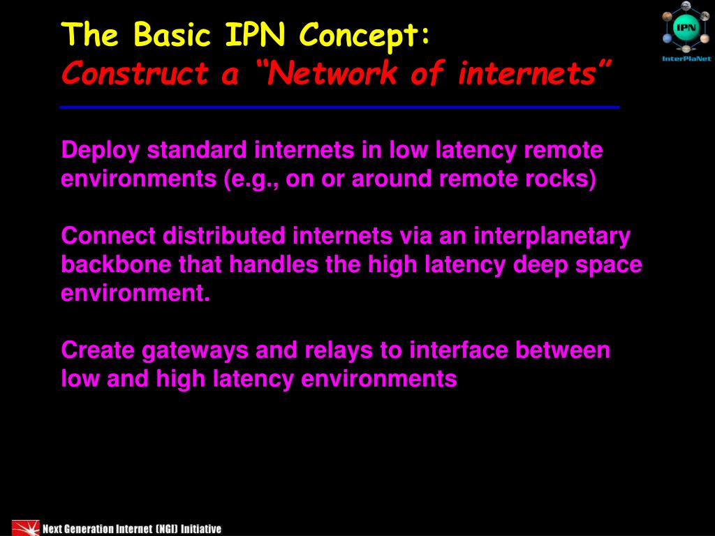 Deploy standard internets in low latency remote environments (e.g., on or around remote rocks) Connect distributed internets via an interplanetary backbone that handles the high latency deep space environment. Create gateways and relays to interface between low and high latency environments The Basic IPN Concept:Construct a “Network of internets”