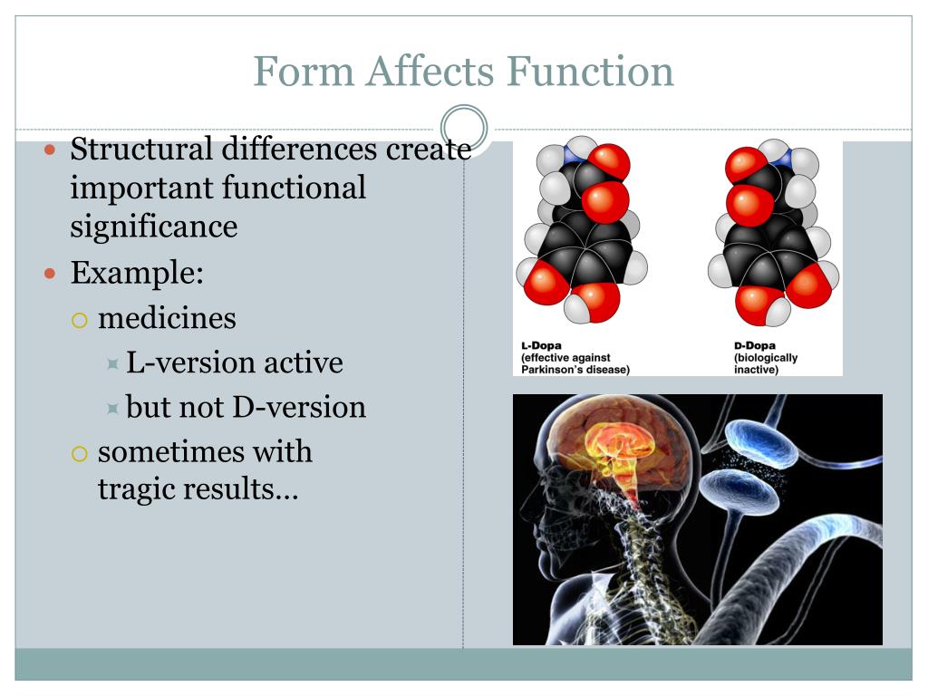 Form Affects Function • Structural differences create important functional significance • Example: • medicines • L-version active • but not D-version • sometimes withtragic results…