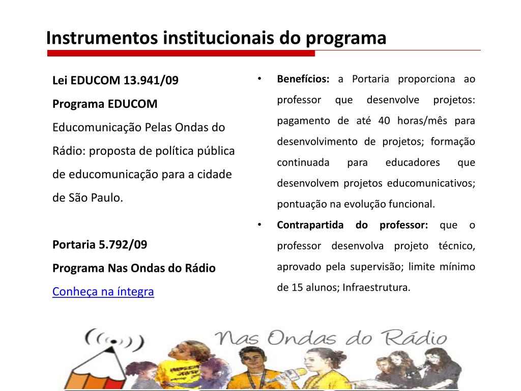 Lei EDUCOM 13.941/09 Programa EDUCOM Educomunicação Pelas Ondas do Rádio: proposta de política pública de educomunicação para a cidade de São Paulo. Portaria 5.792/09 Programa Nas Ondas do Rádio Conheça na íntegra Benefícios: a Portaria proporciona ao professor que desenvolve projetos: pagamento de até 40 horas/mês para desenvolvimento de projetos; formação continuada para educadores que desenvolvem projetos educomunicativos; pontuação na evolução funcional. Contrapartida do professor: que o professor desenvolva projeto técnico, aprovado pela supervisão; limite mínimo de 15 alunos; Infraestrutura. Instrumentos institucionais do programa
