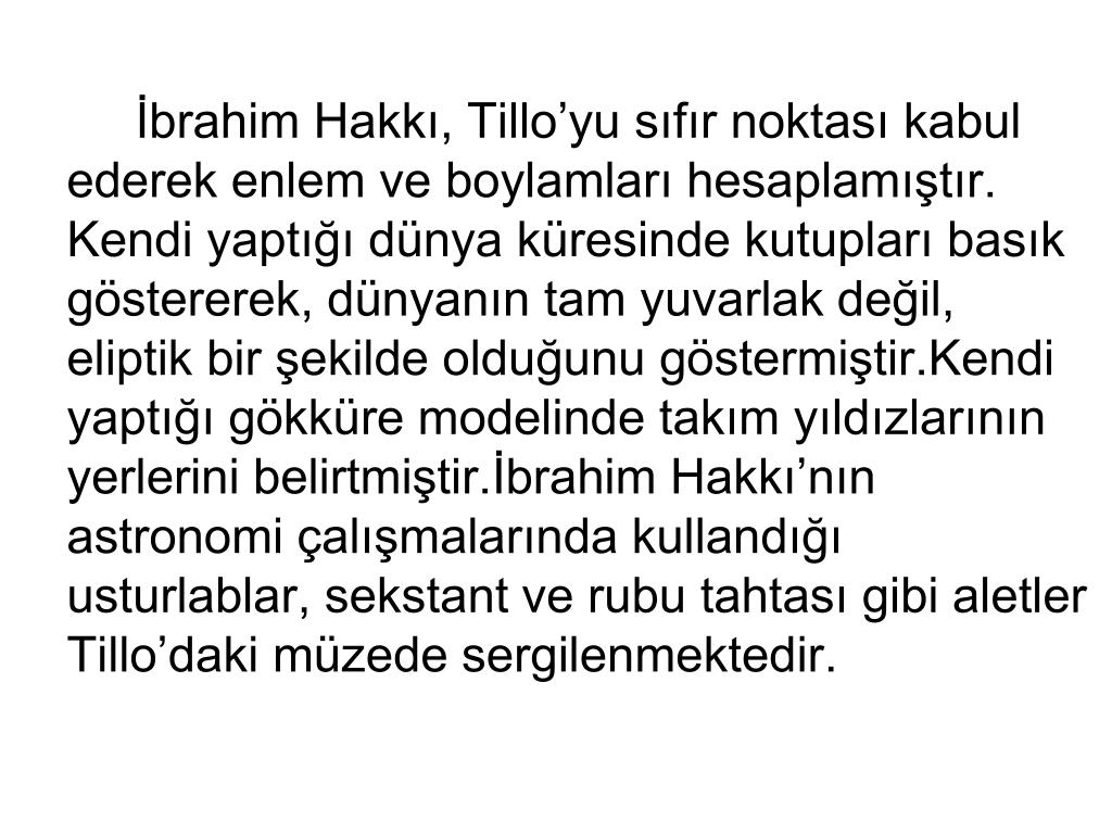 İbrahim Hakkı, Tillo’yu sıfır noktası kabul ederek enlem ve boylamları hesaplamıştır. Kendi yaptığı dünya küresinde kutupları basık göstererek, dünyanın tam yuvarlak değil, eliptik bir şekilde olduğunu göstermiştir.Kendi yaptığı gökküre modelinde takım yıldızlarının yerlerini belirtmiştir.İbrahim Hakkı’nın astronomi çalışmalarında kullandığı usturlablar, sekstant ve rubu tahtası gibi aletler Tillo’daki müzede sergilenmektedir.